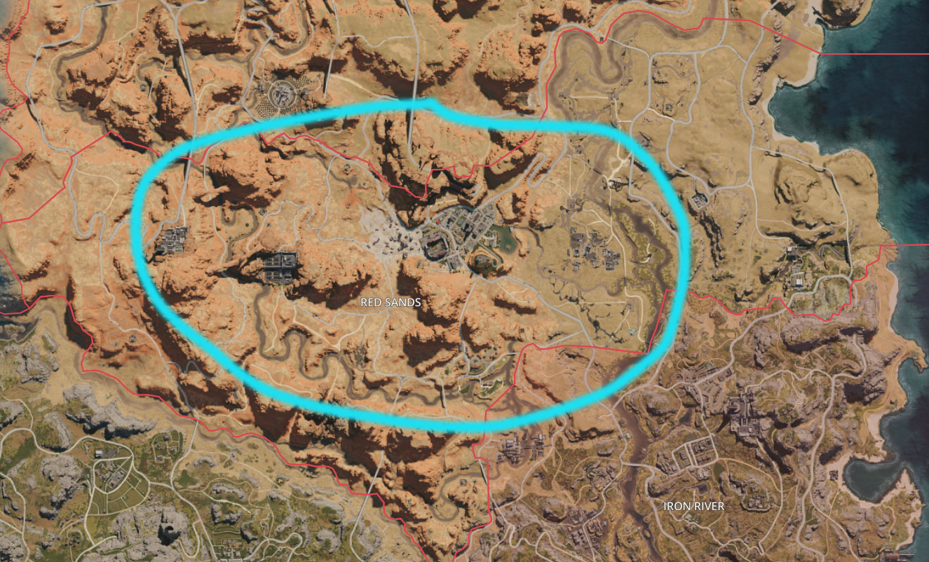 - Sables rouges du sud : Suivez la route le long de la limite sud Sables rouges. Vous pouvez également y accéder par des ponts près de la ferme de la route de la craie du