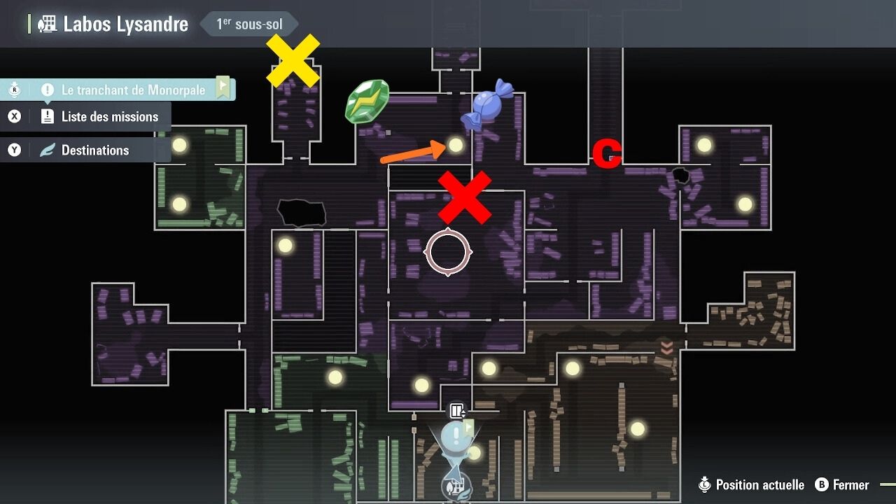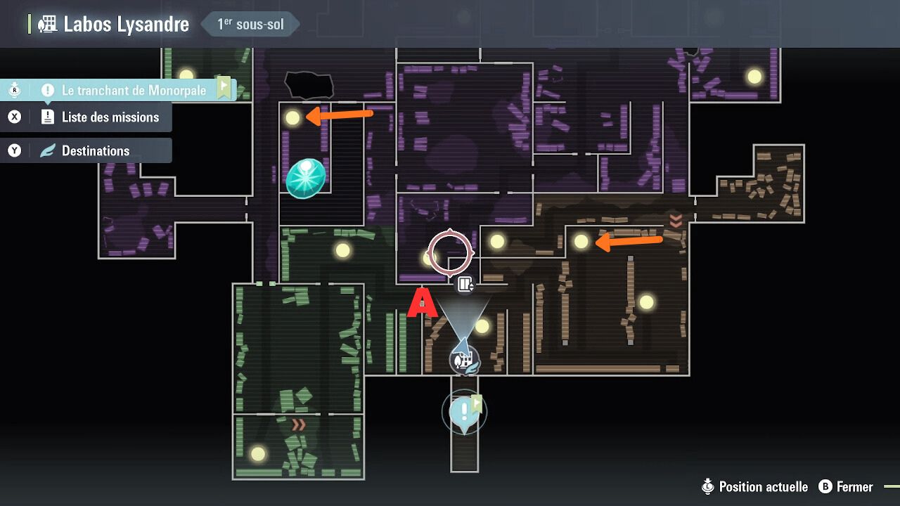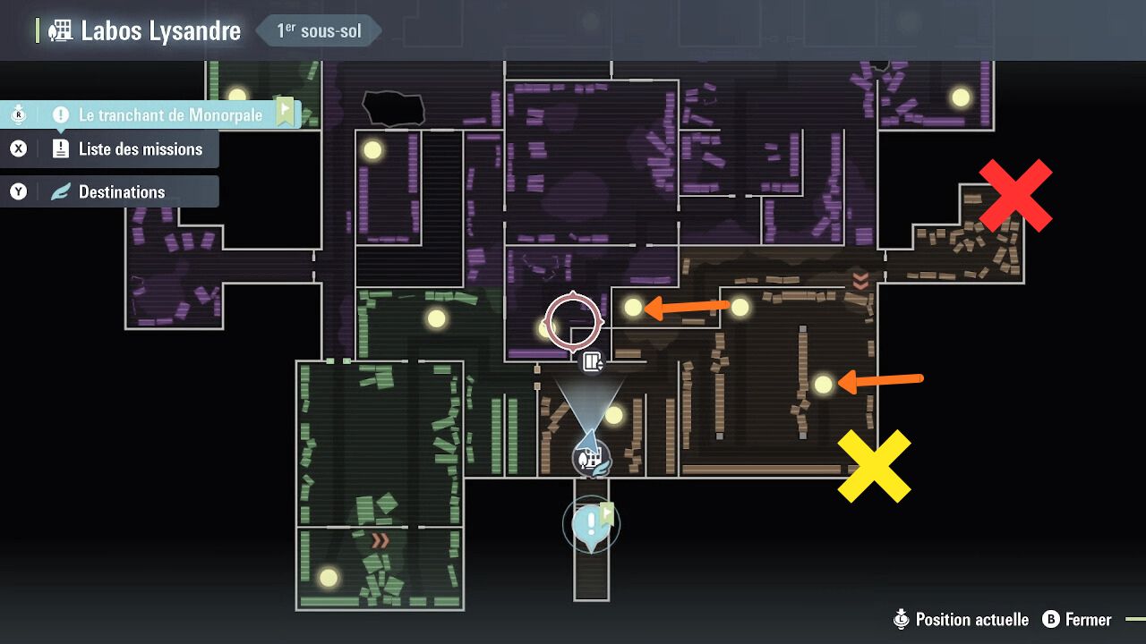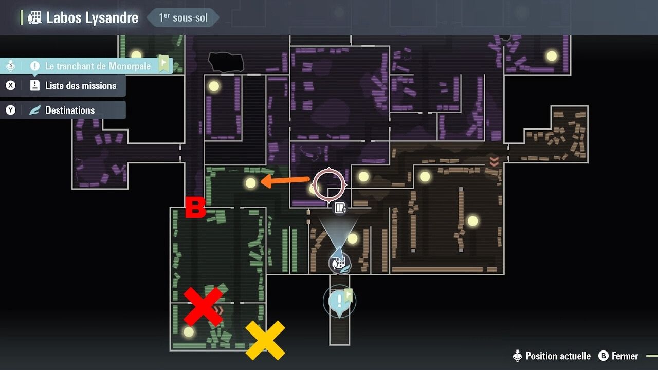 Vous découvrez une nouvelle zone. Votre objectif est de vous rendre au niveau de la croix rouge pour trouver le Passe du Labo A. Juste à côté, vous pouvez récupérer la CT Vibrobscur.