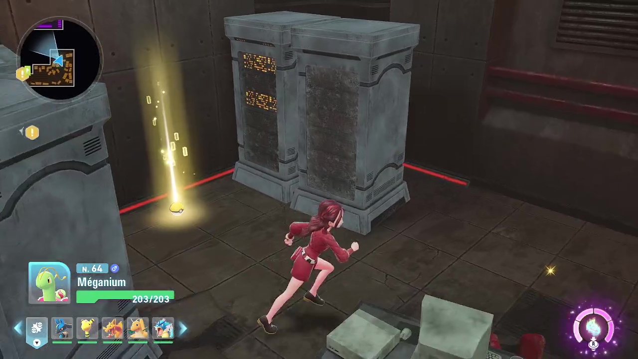 Continuez votre chemin et allez au nord du Dynavolt et Elecsprint pour actionner le levier (croix jaune). Avant de prendre le téléporteur (au niveau de la flèche), vous pouvez récupérer la Pierre Foudre. Prenez les téléporteurs et poursuivez votre chemin pour arriver face à un Abo et un Arbok Alpha. Le Passe du Labo C se trouve au fond de la pièce (croix rouge).