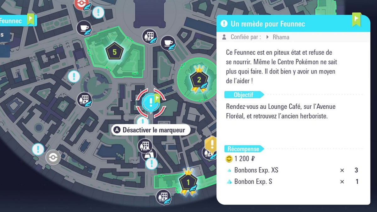 Rendez-vous dans le 2ème arrondissement de Rosavilliers pour retrouver un petit Feunnec malade : on te confiera un quête pour trouver un remède pour guérir le pauvre Pokémon.