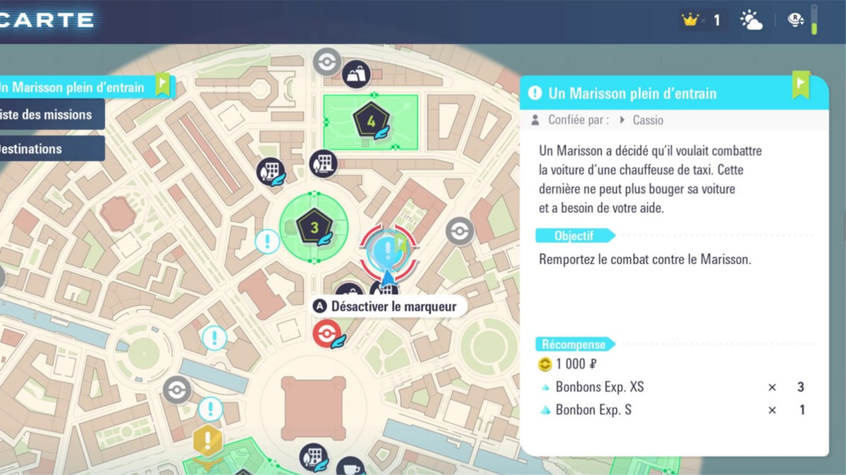 Marisson veut en découdre, d'abord avec un taxi mais maintenant avec toi ! On commence donc avec la quête la plus simple des 3 : il faut affronter Marisson 3 fois d'affilée avant qu'il ne se calme et que tu puisses enfin l'avoir avec toi.