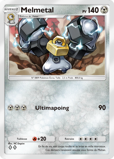 Melmétal n'est peut être pas le Pokémon le plus populaire de la licence, il n'en reste pas moins un incontournable. Il est mis à l'honneur dans l'extension B1 avec une carte ex digne de sa couleur Métal avec un bon pool de PV et une compétence, chère, mais puissante !