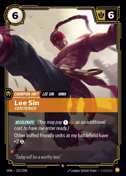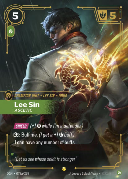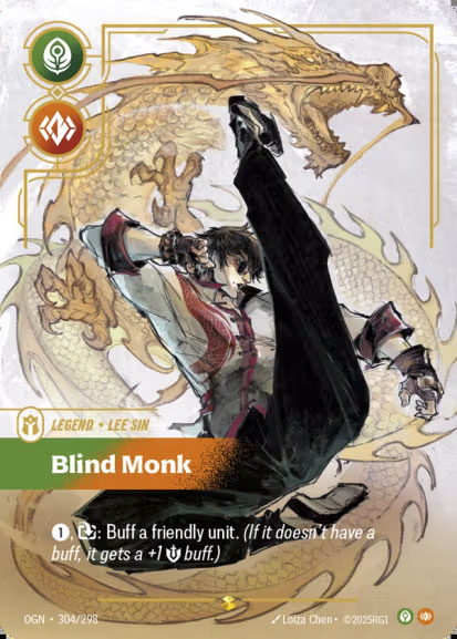 Lee Sin Blind Monk incarne le contrôle et la patience. Effet : Payez 1 Énergie et engagez Lee Sin pour donner +1 Might à une unité sans buff.