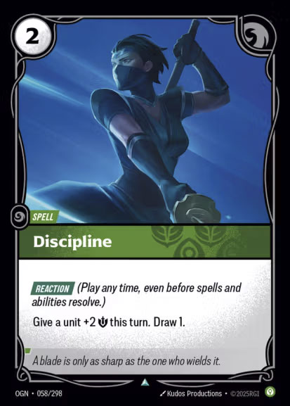 - Discipline : un sort réactif qui donne +2 Might et pioche une carte, un must pour sauver une unité en combat.