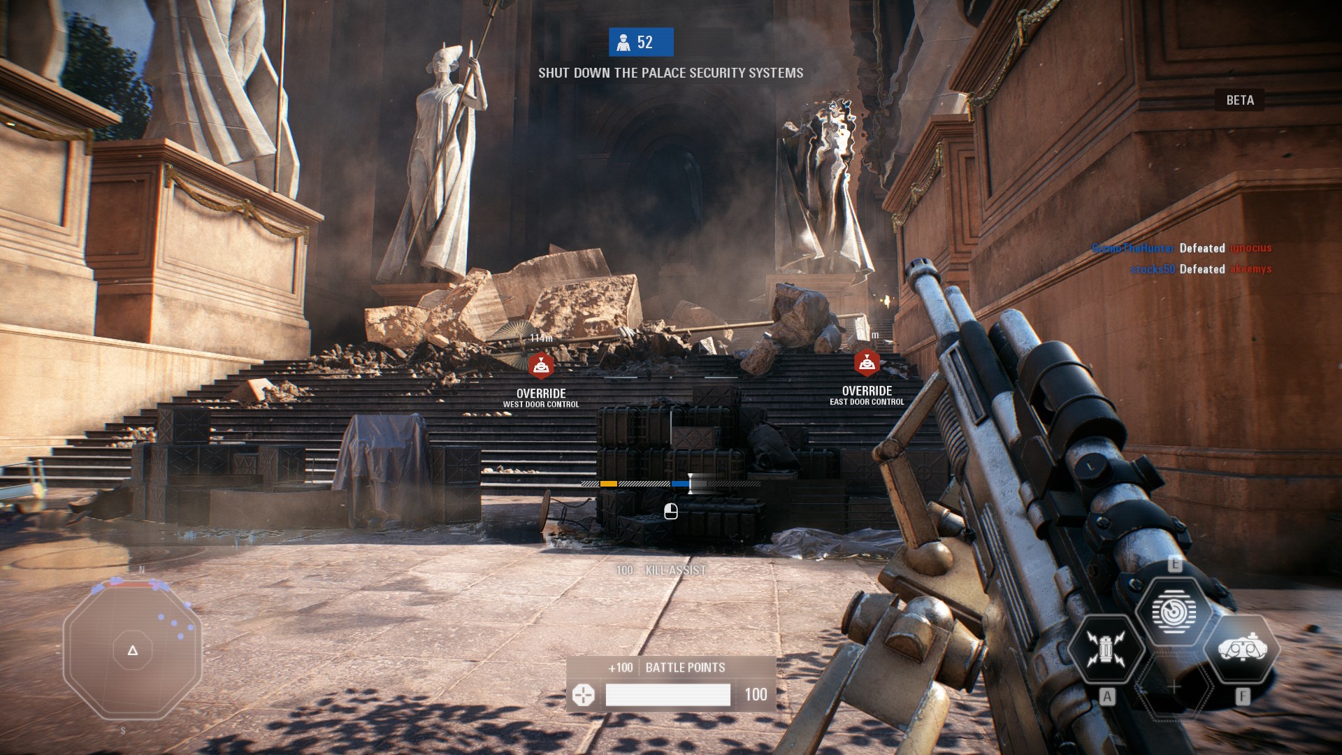 carte de Naboo, vous apparaissez à l’autre bout d’une allée gigantesque et vous subissez le feu nourri des snipers ennemis : ne restez pas à découvert et foncez vers l’abri le plus