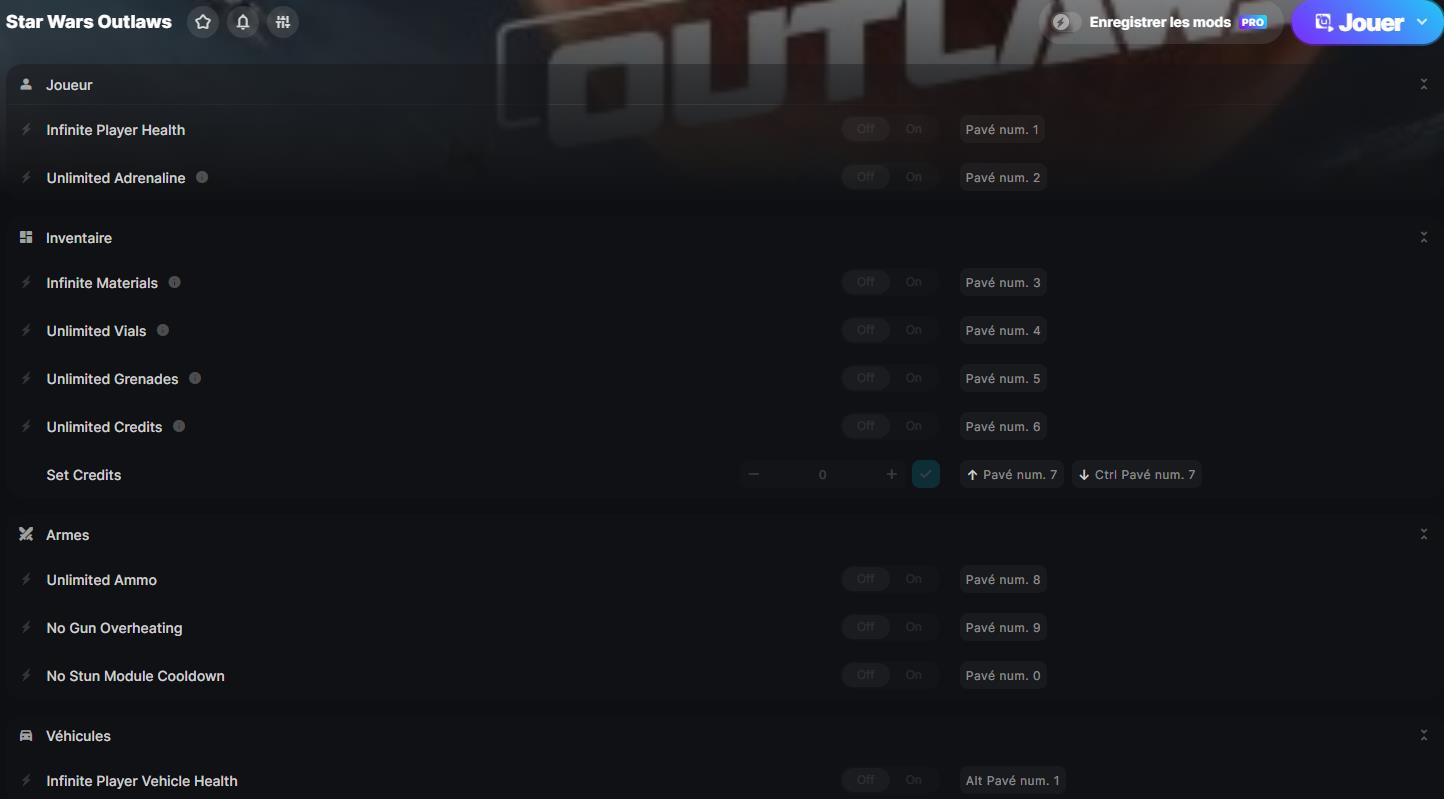 en avant et il vous reste à cliquer sur le jeu pour aller sur sa page avec les mods de triche. Vous n’avez plus qu’à cliquer sur Play pour lancer Star Wars Outlaws et activer la