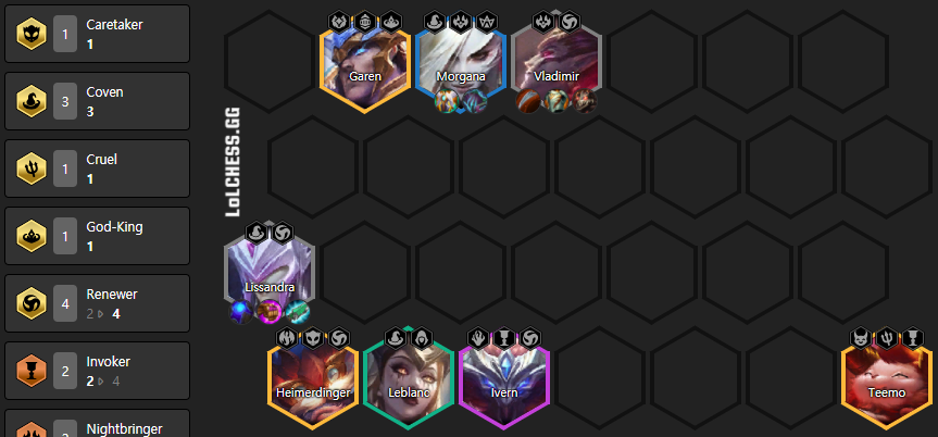 n’hésitez pas à vendre toutes vos unités qui ne sont pas Lissandra, Vladimir, LeBlanc et Morgana en début de partie si cela vous permet de passer à 10 ou 20 PO plus