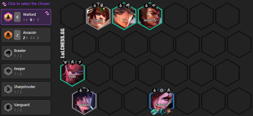 Au niveau 6, vous devriez presque toujours avoir vos 6 Maîtres de guerre. Vous pourrez alors ajouter Pyke pour donner le bonus Assassin à