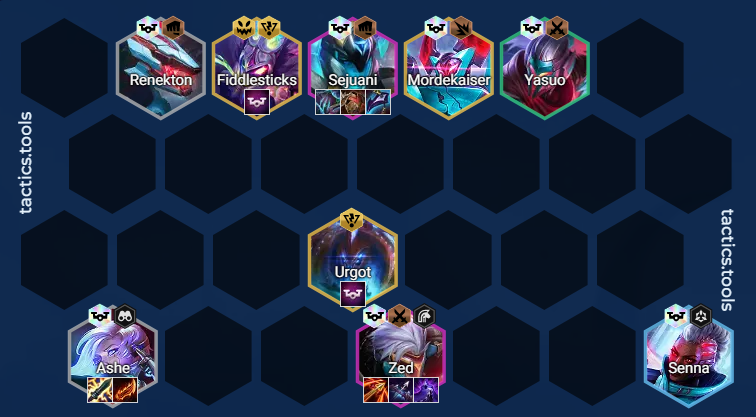 Le positionnement de cette compo est très simple : tous les champions de corps à corps se placent en première ligne sauf Zed. En effet, ce dernier se placera soit en seconde
