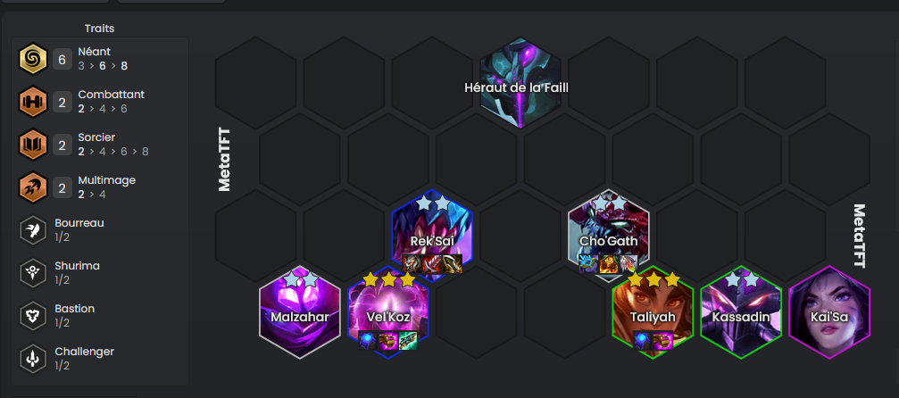 Vous devez vous stabiliser reroll au niveau 7, l’objectif étant d’avoir le héraut de la faille sur les champs de bataille avec 6 Néants et