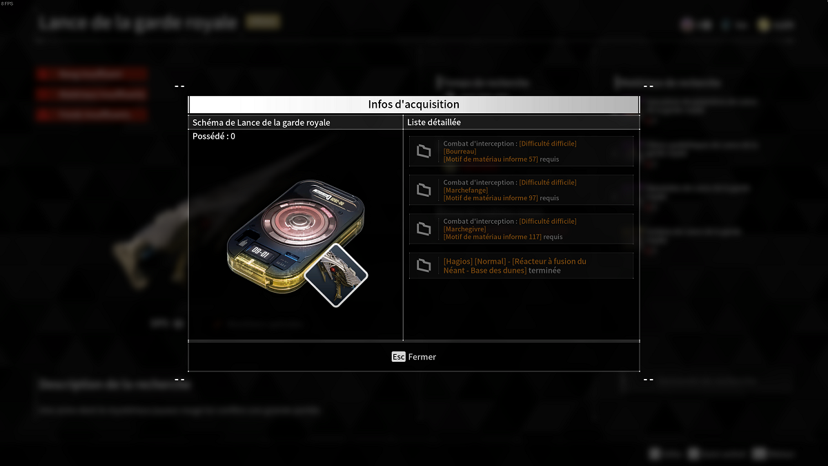 Tous les composants, hormis le schéma de la Lance de la garde royale, peuvent être craftés grâce à différents matériaux. Pour savoir comment les fabriquer, il vous suffit de mettre votre curseur