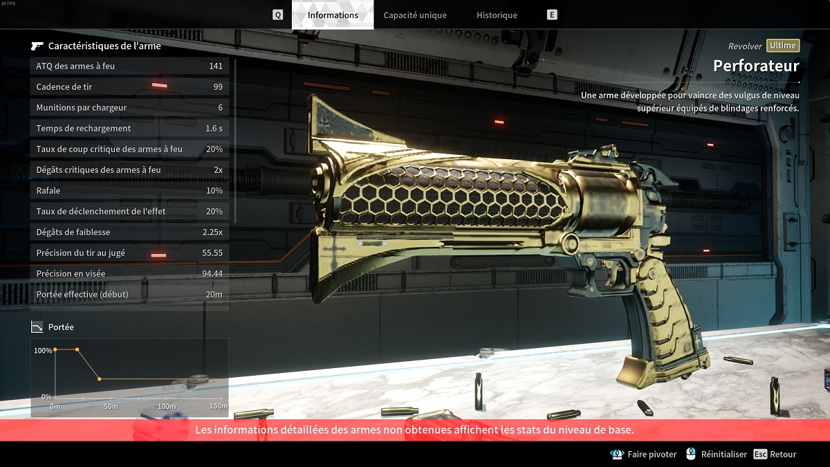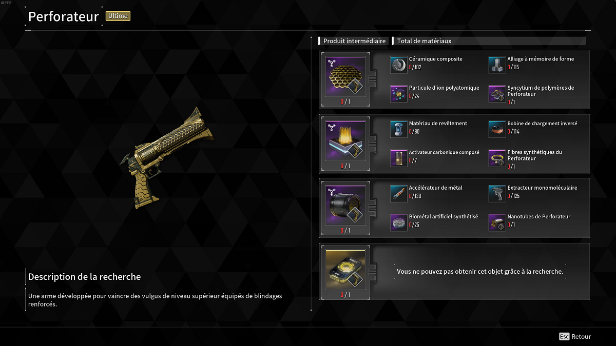 Bref, le Perforateur n’est pas super dur à obtenir, il vous faudra juste tout un tas de matériaux différents. Au niveau de ses statistiques, le Perforateur dispose d’excellents dégâts de base
