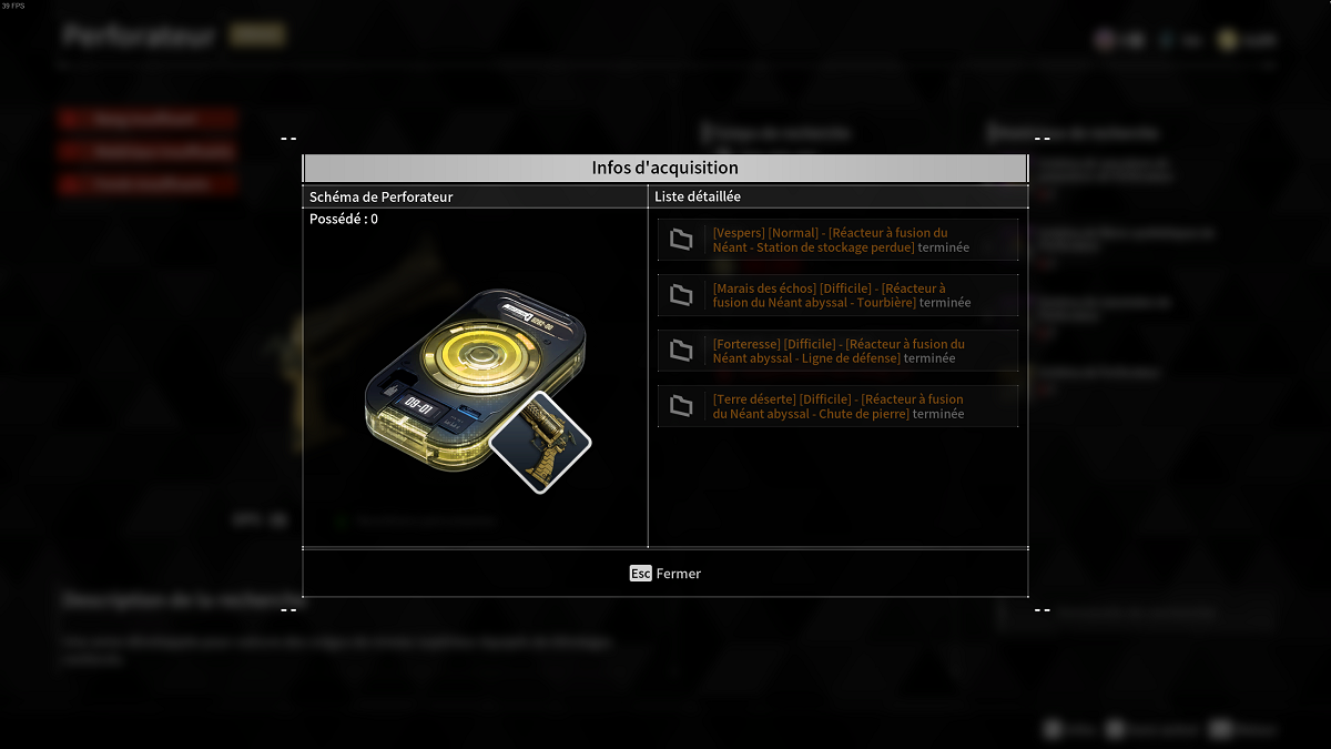 Tous les composants, hormis le schéma du Perforateur, peuvent être craftés grâce à différents matériaux. Pour savoir comment les fabriquer, il vous suffit de mettre votre curseur dessus et