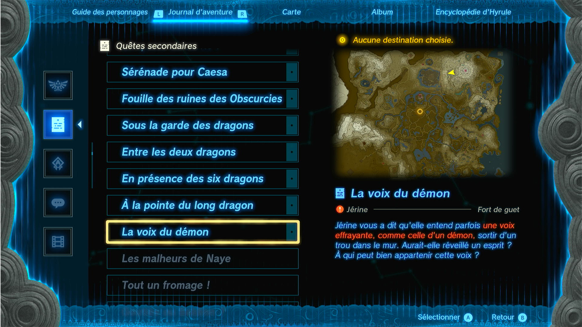 Une fois votre premier temple régional terminé, retournez à Fort de Guet et descendez dans l’Abri. Ici, vous pouvez commencer une quête secondaire « La voix du démon » auprès d’une Hylienne nommée