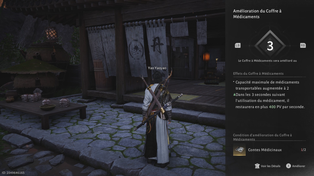 Au-delà des soins immédiats, Yao Yaoyao propose également d’améliorer votre Coffre à Médicaments en échange de Contes Médicinaux. Ces objets s’obtiennent naturellement en progressant dans le monde : coffres, donjons, quêtes et exploration générale.