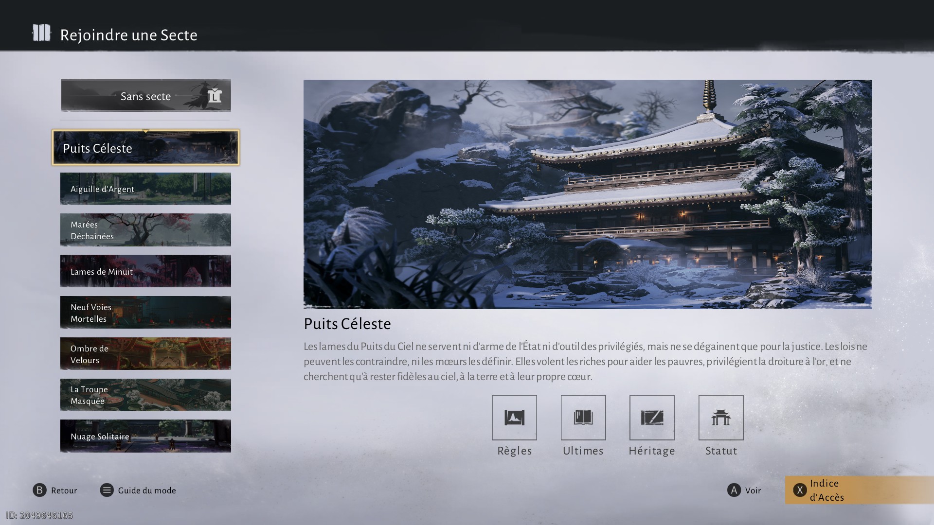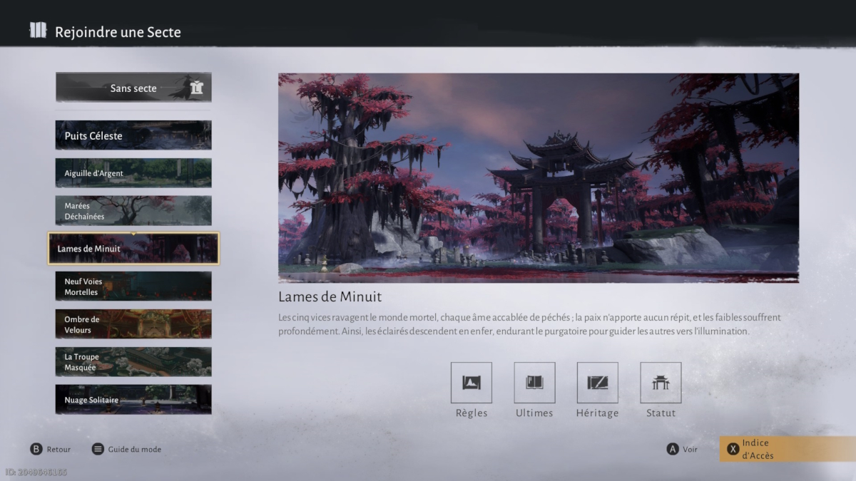 Au lancement, treize options existent : cinq sectes pleinement accessibles, sept encore impossibles à rejoindre, et un état particulier, « Sans secte », pour les joueurs qui souhaitent suivre leur propre voie.