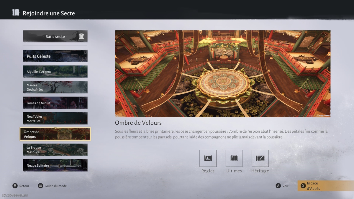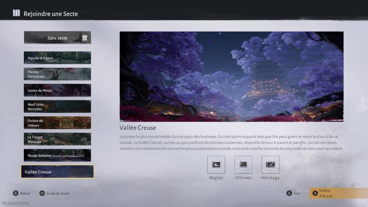 En sélectionnant une secte, un bouton « Indice d’entrée » apparaît : il indique un lieu où obtenir la première piste menant à la quête d’initiation. Une fois l’indice trouvé, vous devrez accomplir une mission spécifique prouvant votre motivation. Lorsque l’épreuve est réussie, vous devenez officiellement disciple, avec accès à la réputation interne, à la boutique associée et aux préceptes qui régissent votre conduite.