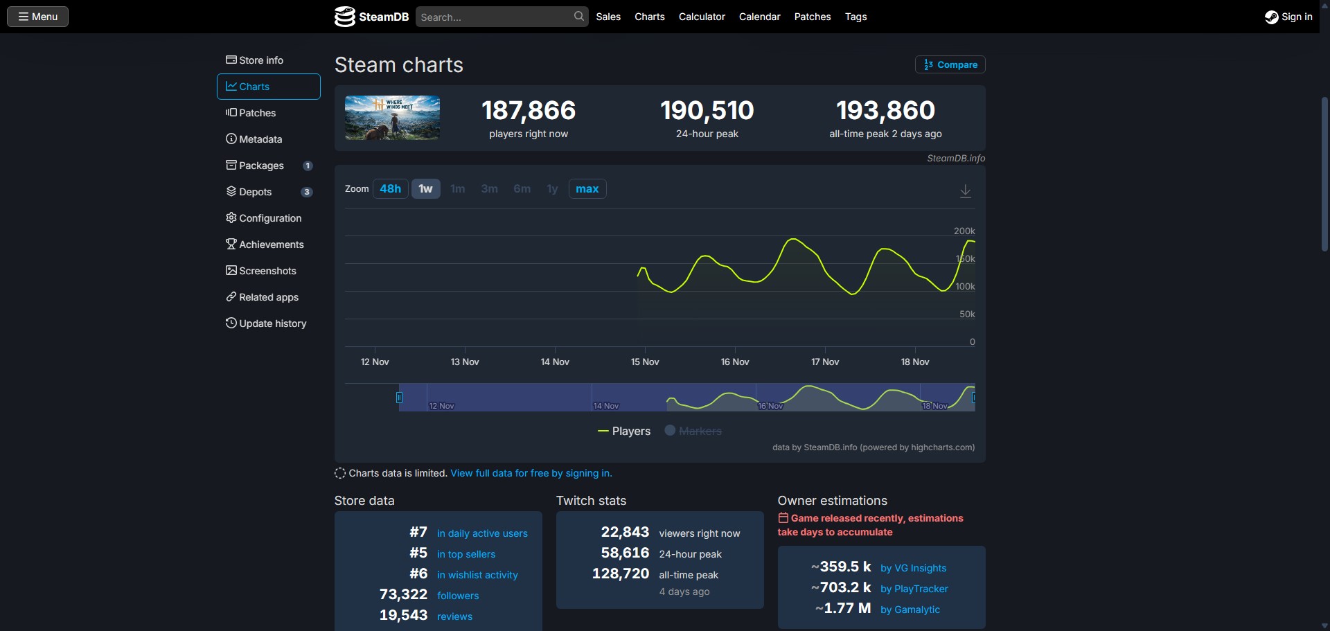 Pour accéder aux statistiques détaillées de Where Winds Meet, il suffit de se rendre sur SteamDB, un site qui compile toutes les données issues de Steam et qui sert également d’alternative au très connu Steam Charts. Vous pouvez consulter toutes les informations du jeu en visitant la page suivante :