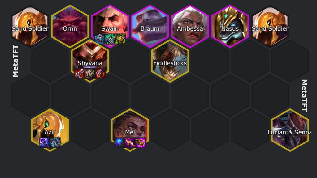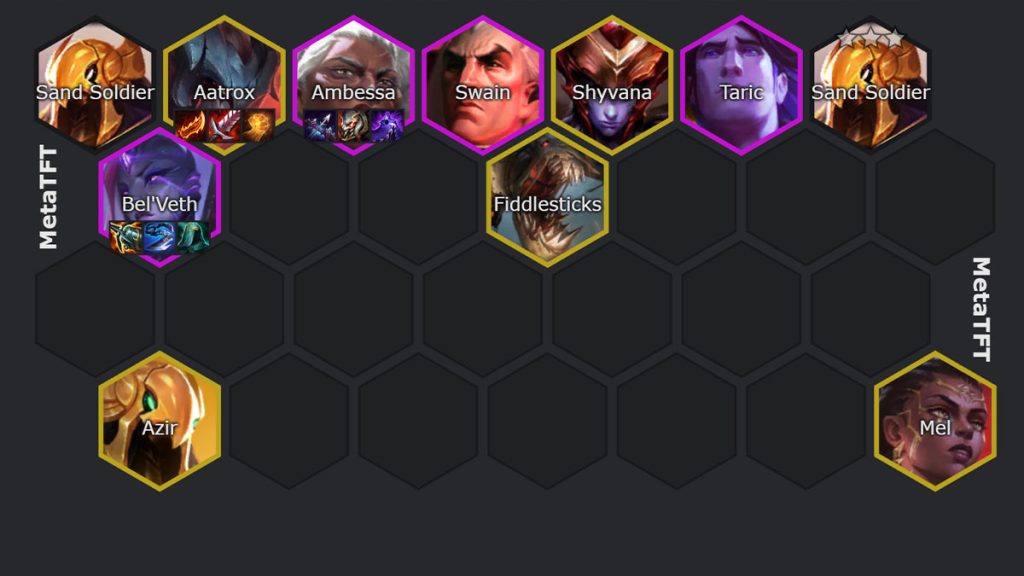 Une composition difficile à jouer puisqu’elle demande de débloquer Mel à l’aider d’une Ambessa 2. C’est une composition où on veut rush le niveau 9 pour trouver les unités 5 costs.