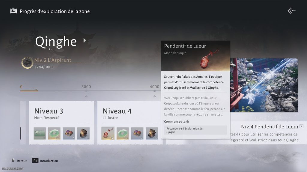 Il est à noter que vous devez atteindre 4 000 points de réputation à Qinghe et pour savoir quels sont les moyens qui vous assurent d’en gagner, vous pouvez cliquer sur Journal, puis sur Exploration pour arriver sur les différentes activités. Enfin, nous vous rappelons que le Pendentif de Lueur est un équipement particulièrement intéressant à récupérer puisqu’il vous permet de débloquer les compétences de légèreté Course Murale – Course ombreuse, que vous pouvez équiper en passant par Développer > Compétences > Compétences mystiques > Mouvement.