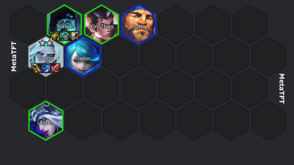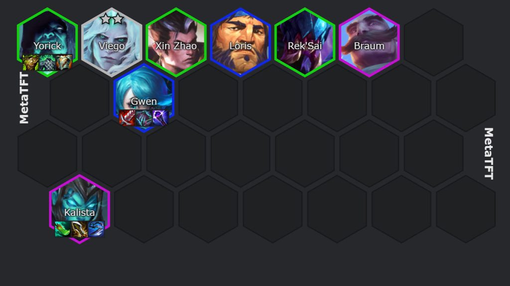 Le but de l’early game est de commencer avec Viego 2 étoiles pour débloquer Yorick et commencer à ramasser les âmes du Trait Îles Obscure le plus tôt possible dans la partie pour débloquer Thresh et Kalista. C’est une excellente composition en win streak, car plus vite, tu débloques Kalista et Thresh, plus vite, tu peux installer ta composition en late game.