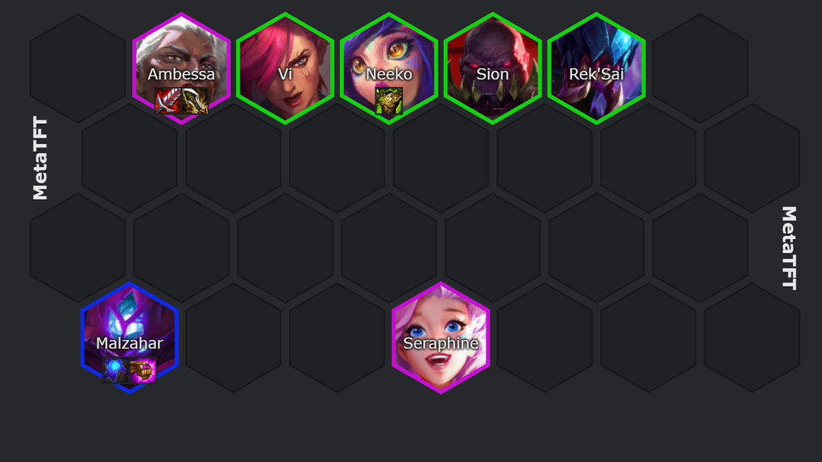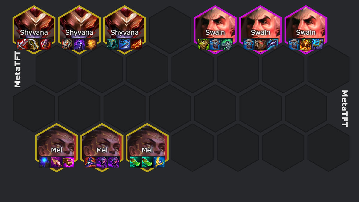 Votre but est donc d’arriver à cette composition. Le plus difficile va donc être d’aller au niveau 9 assez rapidement avec une bonne économie et assez de points de vie pour pouvoir trouver tous vos champions. Généralement, on veut jouer un board solide en early game et se reposer sur un Malzahar qui tiendra les objets de Mel pour vous emmener en late game. Si le niveau 9 est votre objectif, il sera important de roll un peu au 8 pour stabiliser son board et vous permettre d’arriver niveau 9. Il sera important de garder assez de ressource pour débloquer Mel qui nécessite de faire une Ambessa 2 étoiles, qui tient très bien les items de Shyvana.
