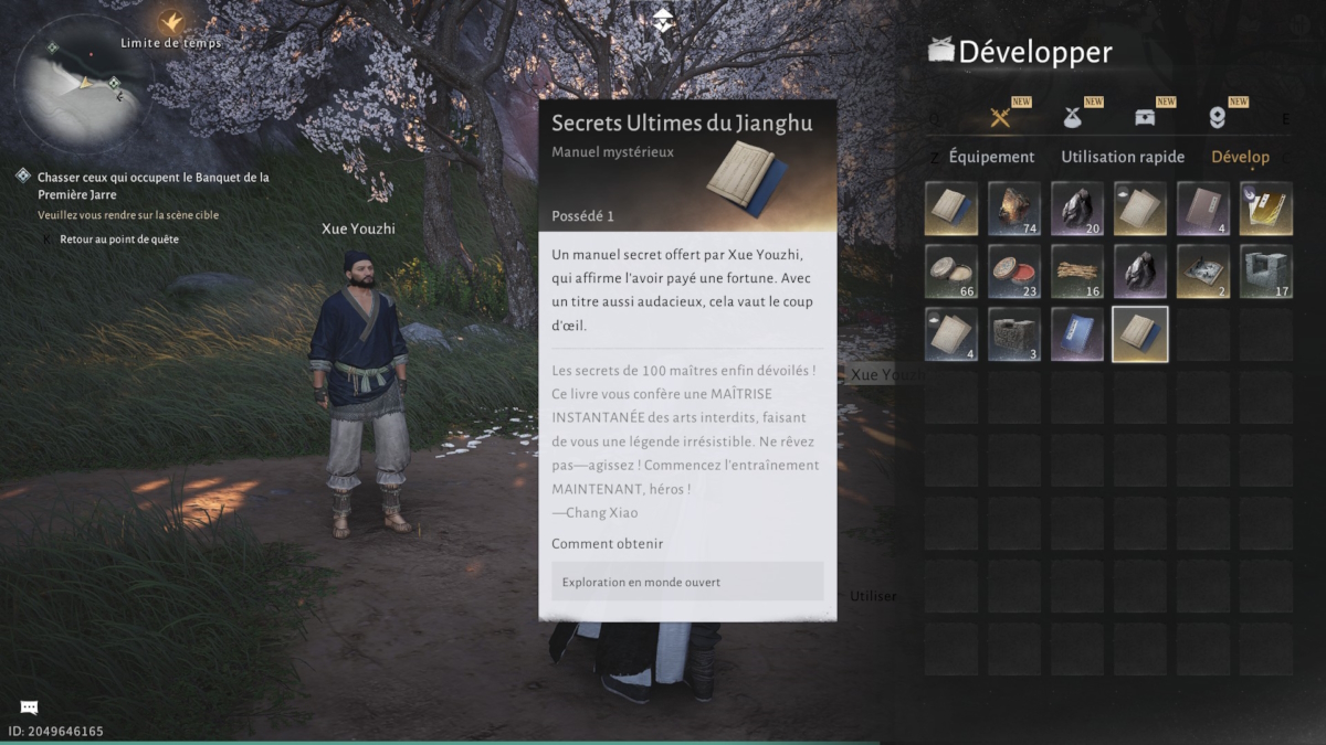 Derrière son nom théâtral et son statut d’objet « consommable », ce registre n’est qu’un piége pour les nouveaux joueurs. Pour l’obtenir, vous devez secourir Xue Youzhi au début du jeu, sur la route entre la Jetée Céleste et la Retraite Bienheureuse. Le PNJ, persuadé d’avoir entre les mains un chef-d’œuvre d’arts martiaux, vous l’offre comme une récompense rare pour l’avoir sauvé des griffes d’un loup.