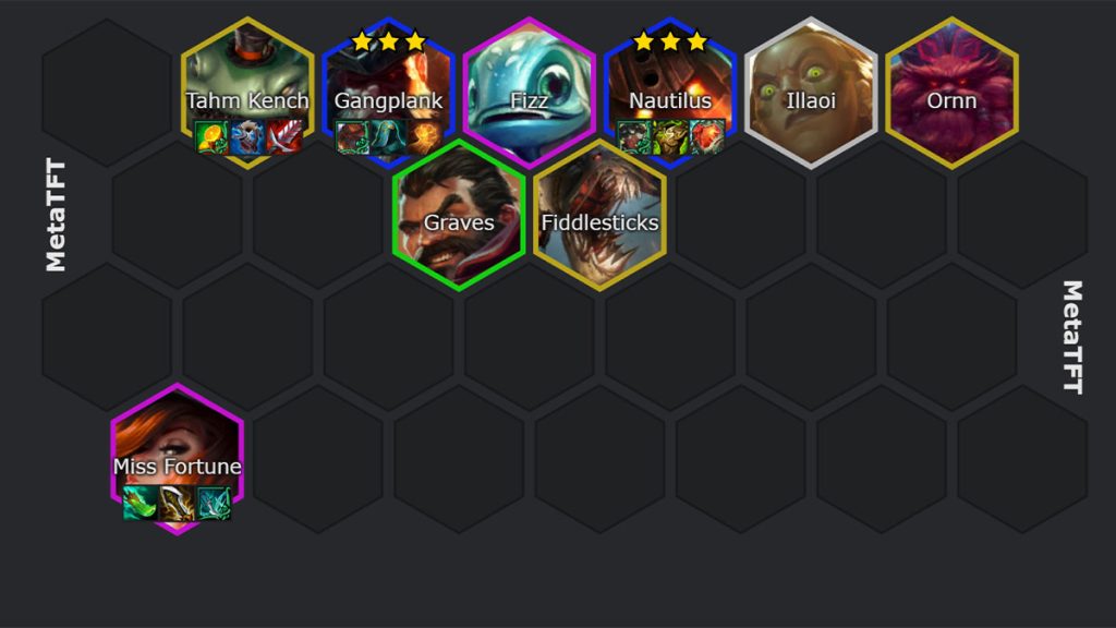 Tu arrives vers le niveau 6 et tu cherches à rentrer 5 Bilgewater en ajoutant Nautilus et Graves pour avoir des meilleures options au marché noir Bilgewater.