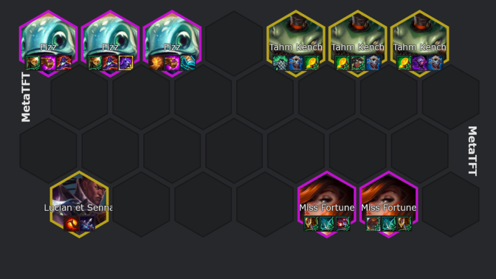 - Si ton board tient bien : rush niveau 8 pour roll tes champions principaux notamment Fizz 2 et Miss Fortune qui te feront tenir pour débloquer Tahm Kench et aller niveau 9