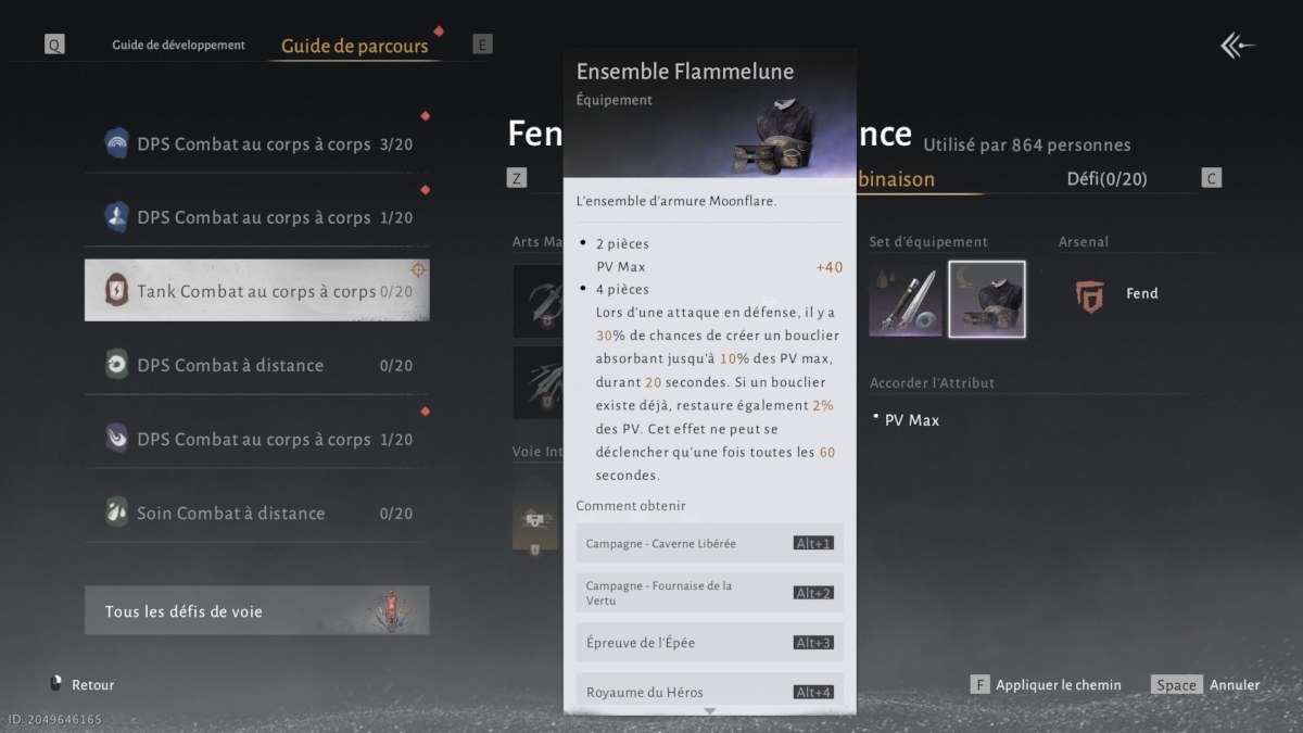 L’ensemble Flammelune est le plus équilibré pour cette approche. Ses boucliers fréquents, capables parfois de restituer des PV lorsqu’ils tiennent suffisamment longtemps, sécurisent chaque échange de coups. En version quatre pièces, il devient une base extrêmement stable.