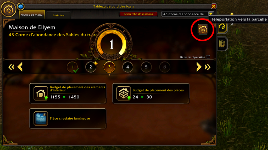 - Cliquer sur le « Tableau de bord du Logis » dans le menu du jeu (touche par défaut « H ») et sélectionner « Téléportation vers la parcelle » pour atterrir exactement là où se trouve votre Logis.