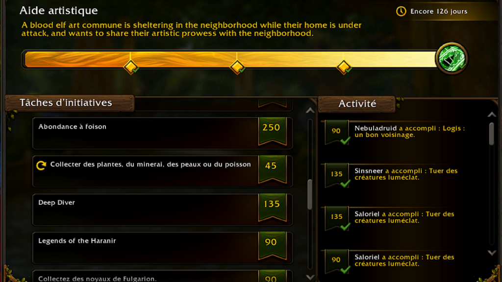 Le système d’initiative permet au Logis de World of Warcraft de ne pas isoler les joueuses et joueurs dans leurs parcelles. Il s’agit d’un système de progression de Quartier : chaque joueur contribue à sa petite échelle à l’évolution du Quartier entier selon de petites missions accessibles chaque jour afin d’obtenir des récompenses selon un thème changeant régulièrement. Les missions sont diverses et variées : PvE, PvP, combats de mascottes, il y en a pour tous les goûts !
