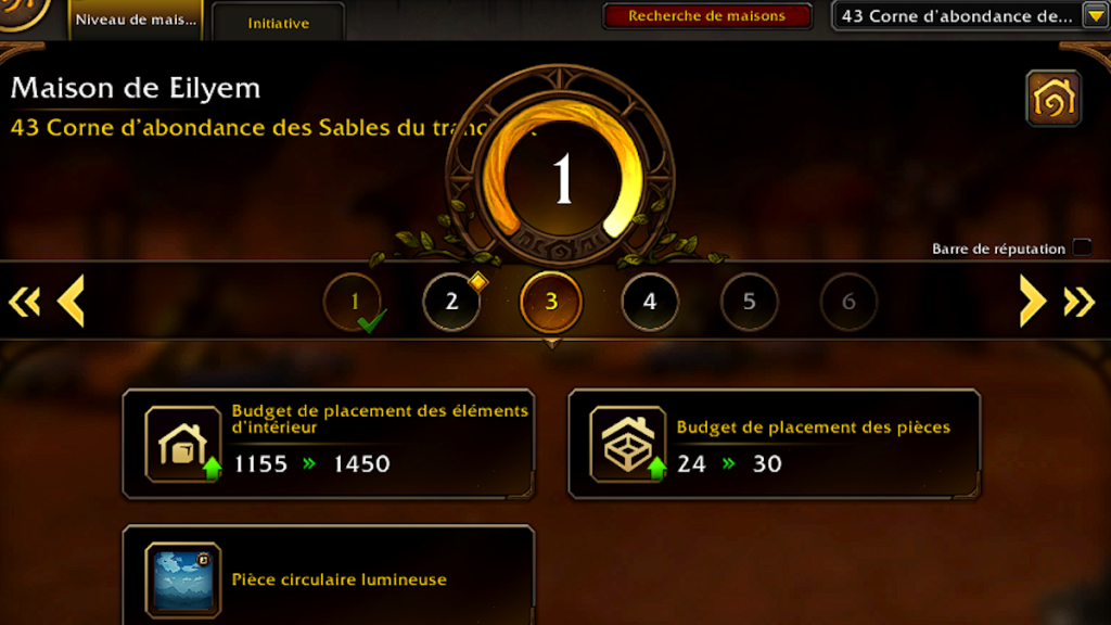 Premier onglet du Tableau de bord de Logis, le Niveau de maison s’inspire de l’interface de Renom afin de vous donner la sensation de faire évoluer votre Logis. Il fonctionne selon un système de points d’expérience que vous gagnez progressivement à mesure que vous obtenez de nouveaux Décors pour votre parcelle. Mais attention : dans la plupart des cas seule la première acquisition d’un Décor vous octroie de l’expérience, inutile donc d’acheter un même objet en boucle dans l’espoir de farm les Niveaux de maison !