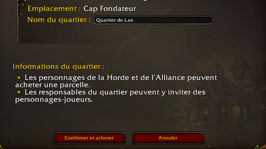 Vous pourrez alors choisir le nom de votre Quartier et y inviter qui vous souhaitez. De plus, tous les personnages indépendamment de leur faction pourront y acheter une parcelle. En revanche, pour pouvoir créer un Quartier privé au Cap Fondateur vous devrez acheter la charte avec un personnage de l’Alliance, tandis que pour un Quartier privé au Rivage de Tranchevent vous devrez acheter la charte avec un personnage de la Horde.