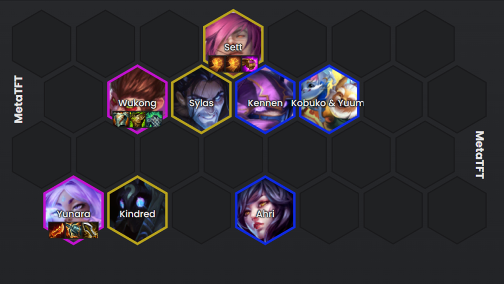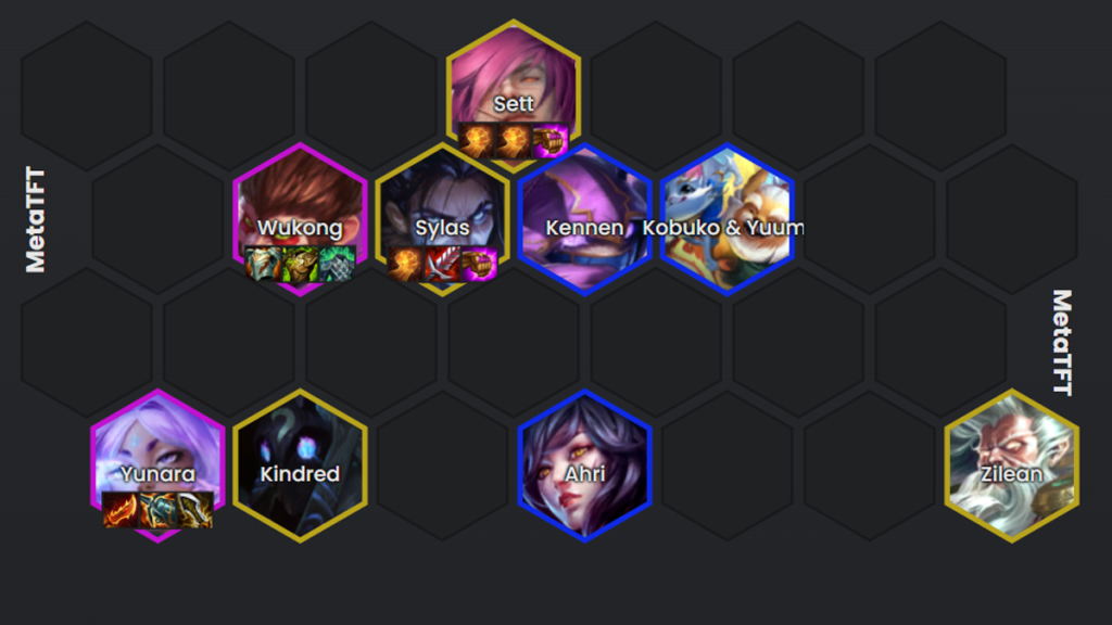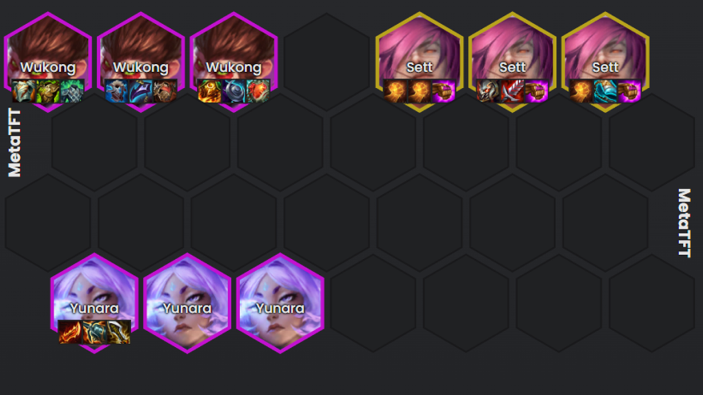 Quand tu passes niveau 8, c’est le moment où il faut débloquer Sett : Mets Wukong seul devant avec tous les items défensifs et tous les autres dans les 2 dernières lignes.