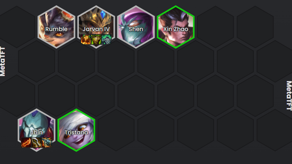 Idéalement tu veux avoir Shen ou Rumble 2-étoiles devant pour porter les items défensifs et qui permettra à votre Jhin de mettre les dégâts nécessaires.