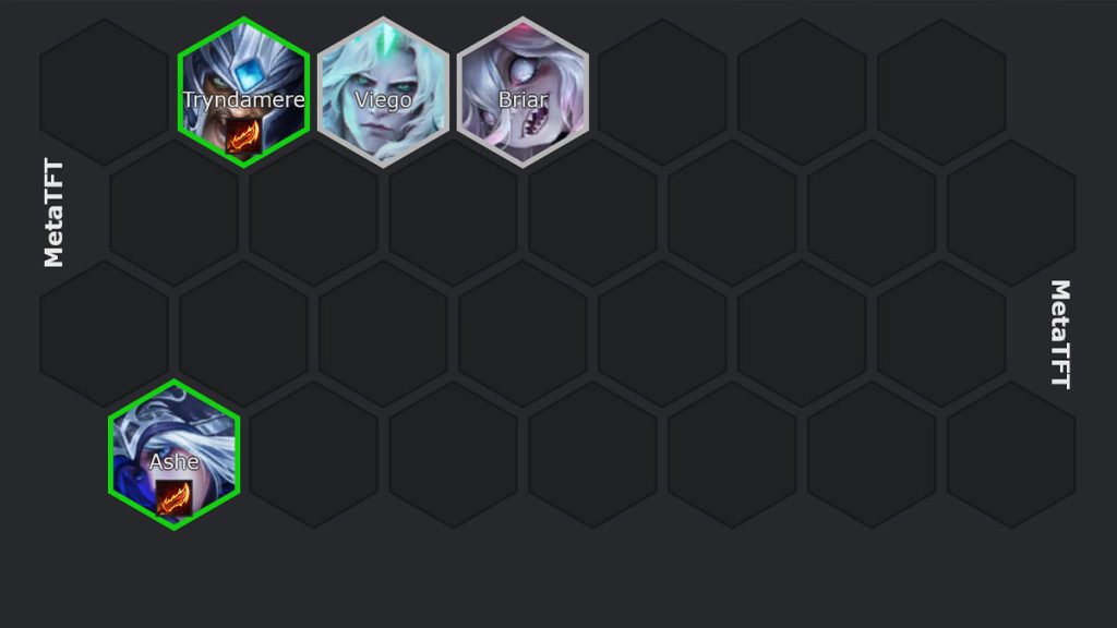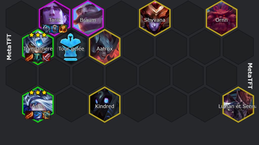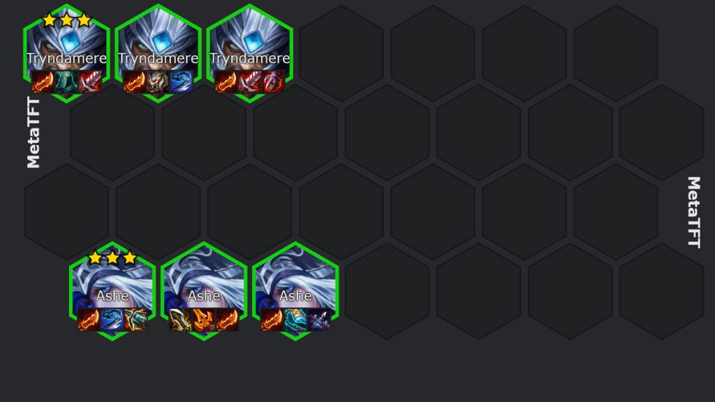 On cherche à arriver à cette composition avec Ashe et Tryndamere 3 étoiles en carry. C’est une composition très simple à jouer qui est envisageable lorsqu’on a Ashe très tôt dans la partie et des items de type vitesse d’attaque comme une Guinsoo.