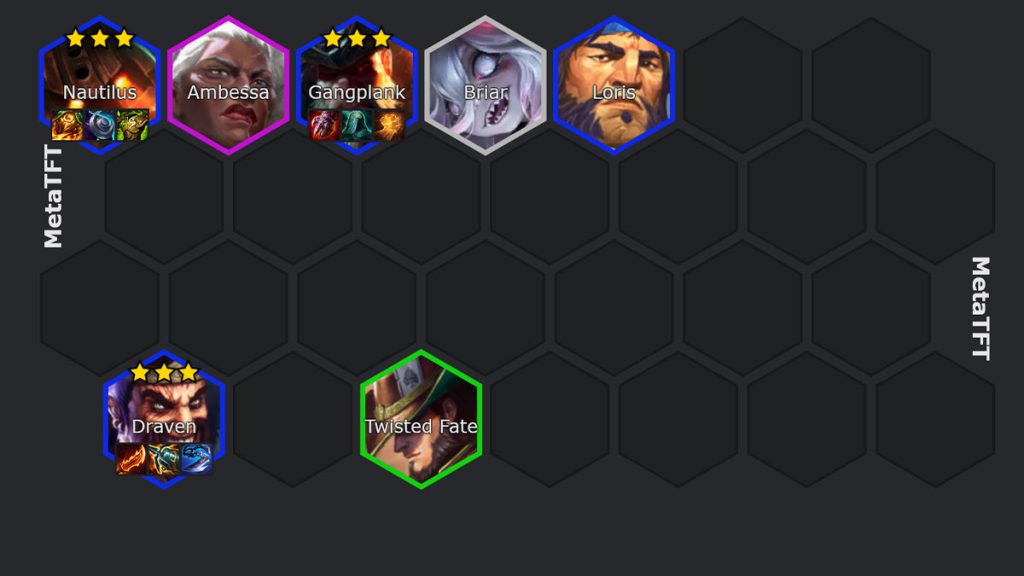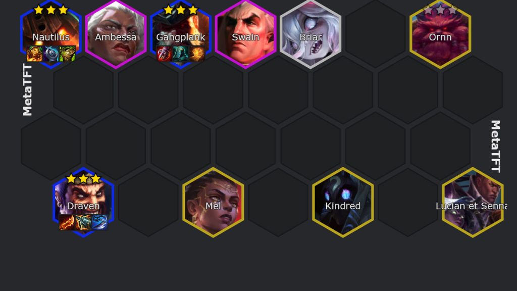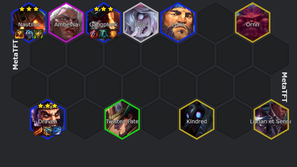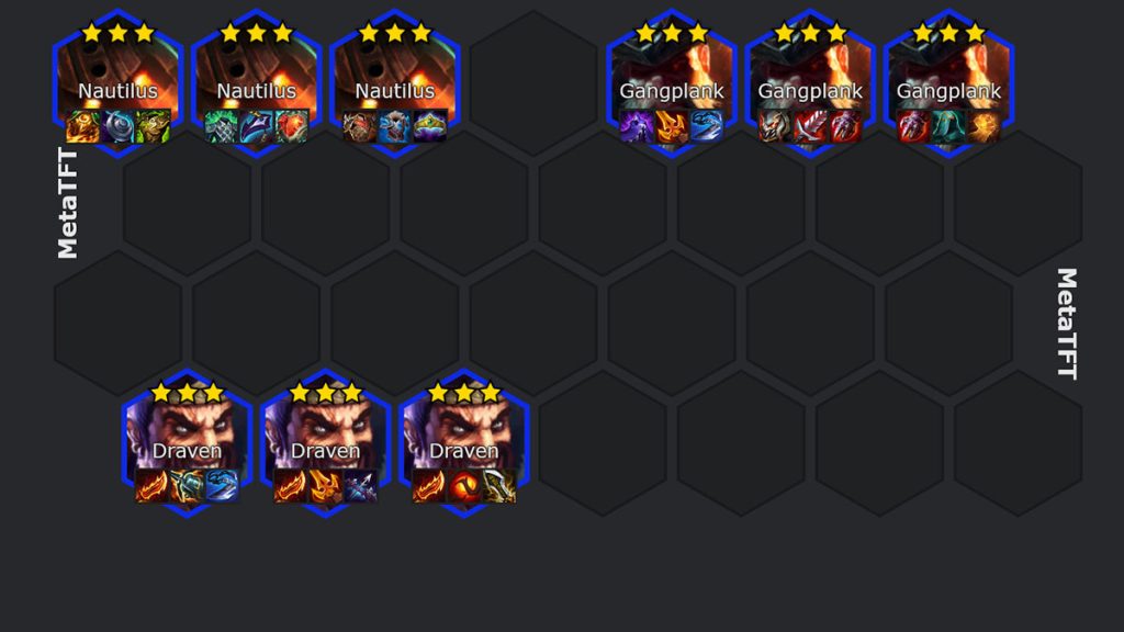 La compo Draven Reroll est une composition reroll facile à jouer sur le set 16 de TFT. Le principe est de trouver Draven en début de partie avec un open Bilgewater pour winstreak et générer énormément de ressources avec Draven et le marché noir. On va aller niveau 7 pour trouver Gangplank, Draven et Nautilus 3 étoiles qui seront les principales unités de notre composition.