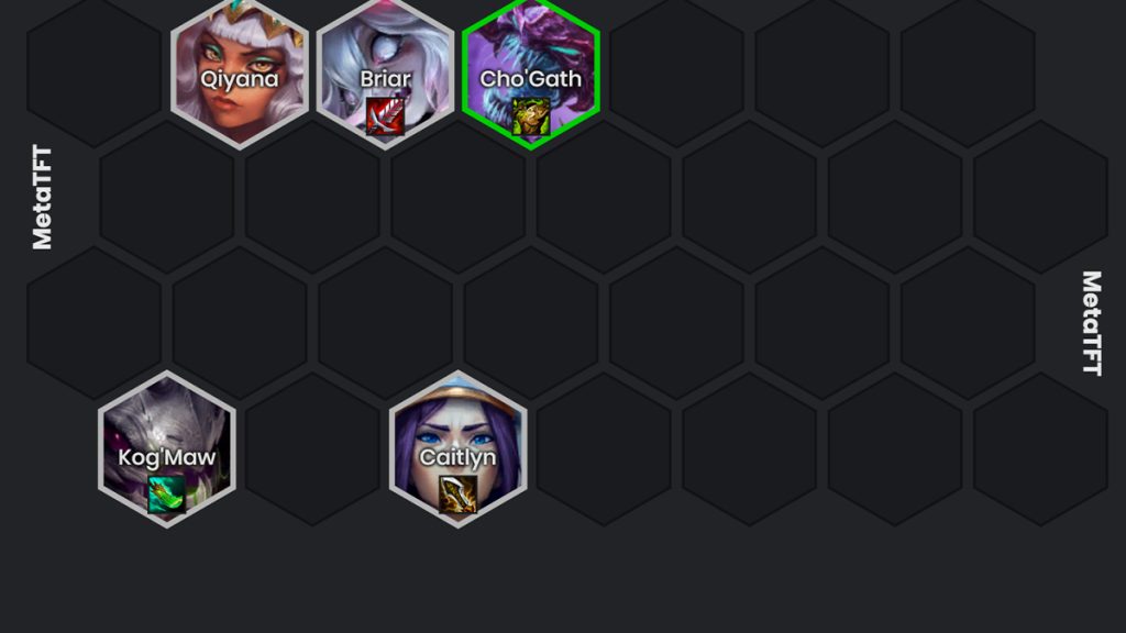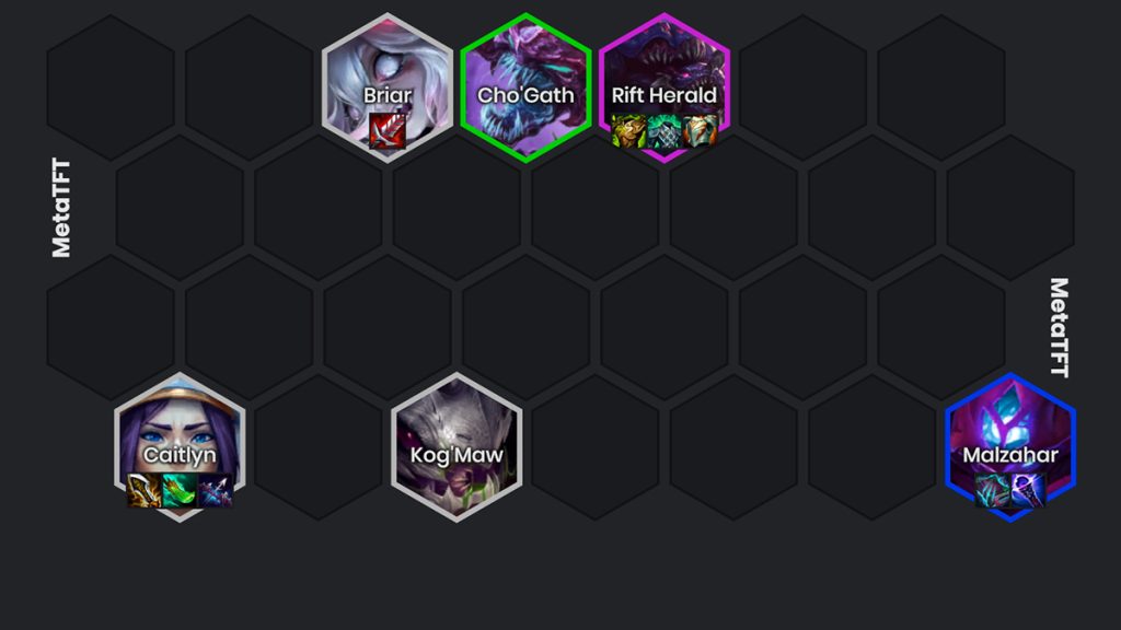 L’objectif est donc d’aligner les Néants rapidement en début de partie pour débloquer le Hérault de la faille qui demande 8 combats avec le trait néant activer. On va jouer Caitlyn pour tenir les objets de Kai’Sa en début de partie si tu as des items AD, les items AP peuvent être tenu par Kog’Maw.
