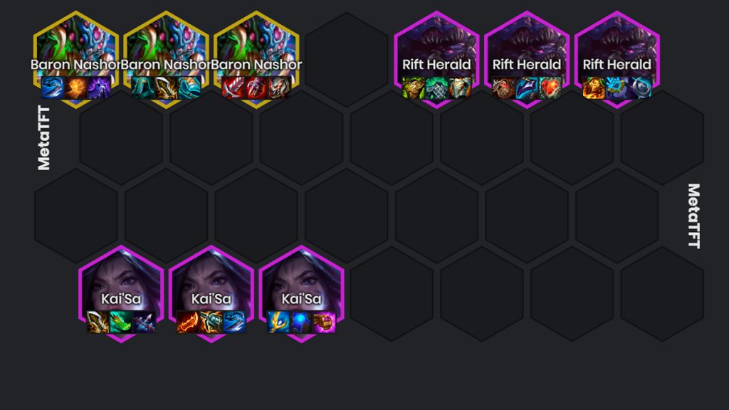 La compo Néant est une composition à connaître sur le set 16 de TFT. Elle repose sur Kai’Sa, un carry DPS avec le Hérault de faille en Tank et le Baron Nashor en carry late game pour faire Top 1. Dans cette version, on préfère une version AD du personnage. C’est une composition simple à jouer puisque c’est une verticale mais attention, il est difficile de gagner la partie sans arriver niveau 10 et débloquer le Baron Nashor qui est votre porte vers le top 1.