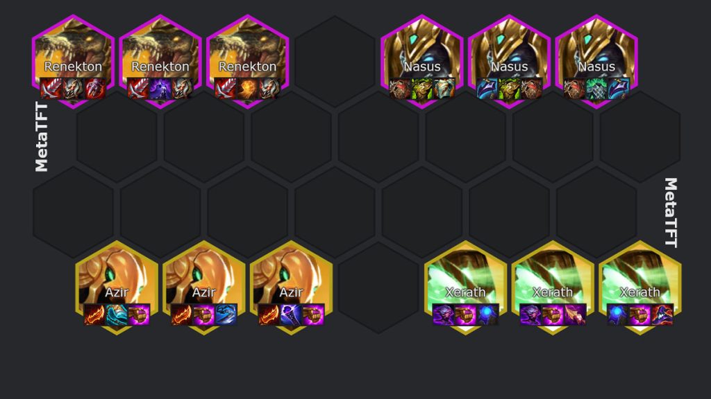 La compo Azir Shurima est une composition à ne pas sous-estimer sur le set 16 de TFT. Elle repose sur AzirXerath et Renekton en carry principal et Nasus en tank. Ce n’est pas une composition facile à mettre en place puisque débloquer les 4 Shurima te fera gagner la partie, mais autant dire que ce ne sera pas une partie de plaisir. Je te dis tout ce qu’il faut savoir sur cette composition et sa place dans la meta.