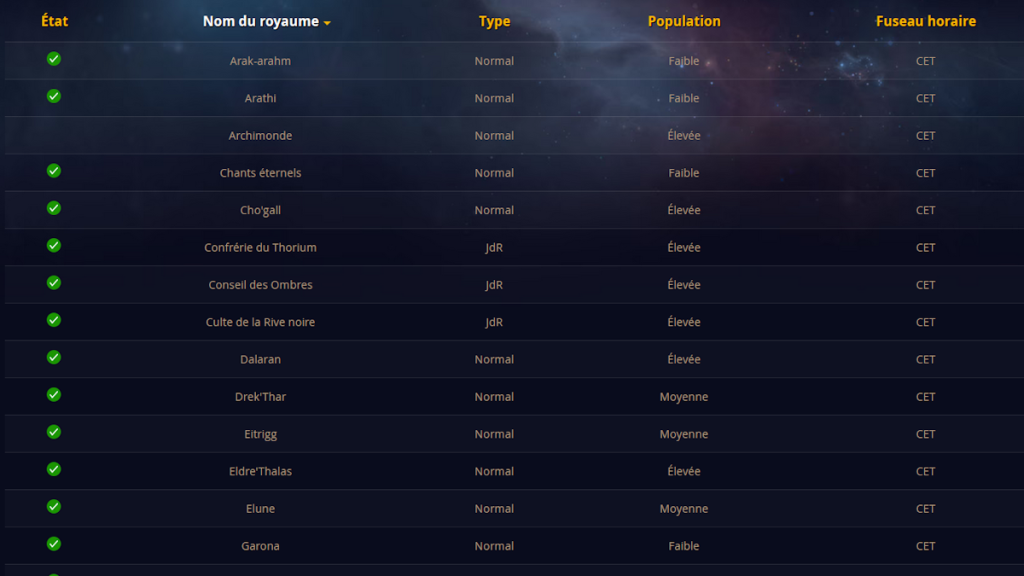 L’état des serveurs de WoW n’est pas toujours très clair lorsqu’on débute le jeu. Celui-ci est notamment visible lorsque vous entrez en jeu et sélectionnez votre serveur. Plusieurs statuts existent afin de déceler l’état de santé d’un royaume donné, et il convient de savoir à quoi chacun correspond afin de ne pas vous retrouver sur un serveur trop désert ou au contrairement trop densément peuplé : sur les premiers vous vous sentirez très seuls en dehors des phases d’affluence de joueurs (sorties de Patchs, extensions), et sur les seconds les événements spéciaux (Patchs, extensions) vous soumettent à de forts risques de déconnexions et autres joyeusetés.