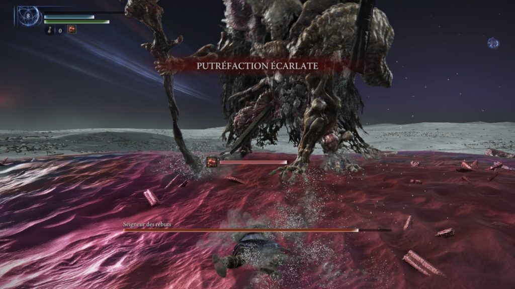 La seconde phase transforme le Seigneur des Rebuts en prédateur beaucoup plus agressif. Il se déplace en bonds rapides, redouble ses charges horizontales et accélère la plupart de ses combos, ce qui impose une lecture encore plus attentive de ses intentions. L’arène devient alors un labyrinthe de zones corrompues.