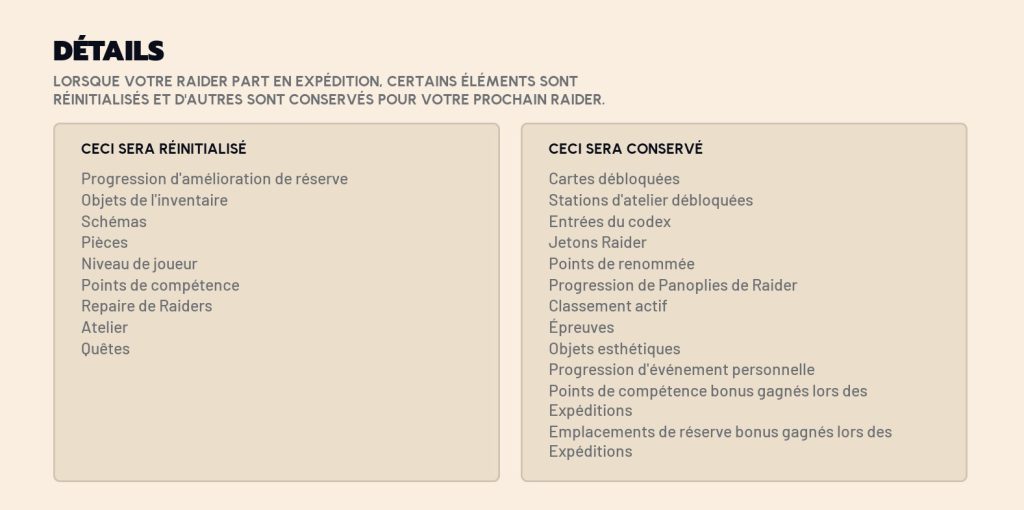 - L’accès au repaire de Raiders et à l’Atelier (à débloquer de nouveau, mais sans perdre les stations ni leurs niveaux)