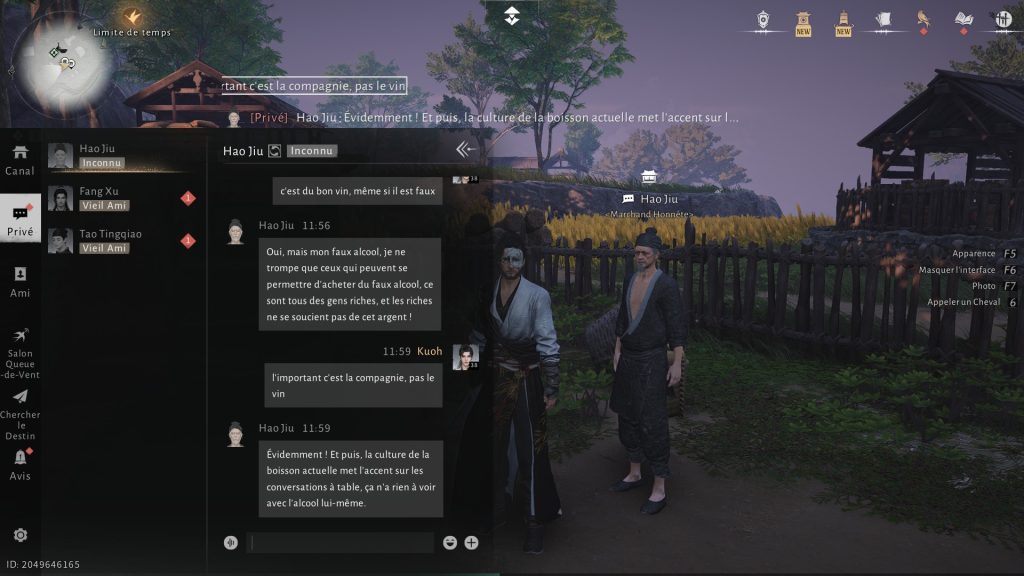 Il arrive également que certains PNJ deviennent agressifs en plein dialogue. Si cela se produit, revenir à l’écran de connexion permet de rétablir la situation sans pénalité. Enfin, même si Hao Jiu semble satisfait, le dialogue ne se termine pas toujours automatiquement. Pensez à relire l’indice affiché dans l’interface, qui précise la condition de victoire attendue, et orientez vos réponses pour y correspondre.