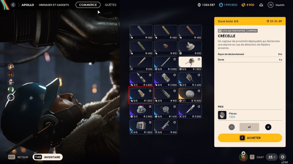 - L’achat auprès d’Apollo, vendu au prix de 1920 pièces / l’unité, il est possible d’en acheter 6 par jour, entre 1 h du jour précédent et 1 h du jour suivant