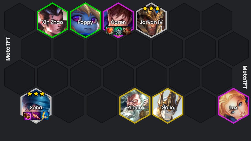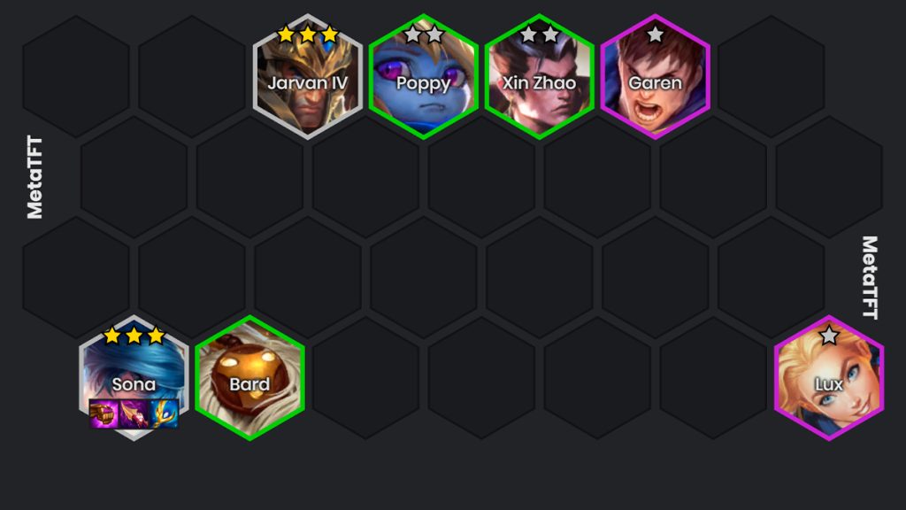 Pour arriver à cette composition, c’est très simple. On veut avoir un start Demacia avec des Sona et Jarvan IV pour les faire passer 3 étoiles rapidement.