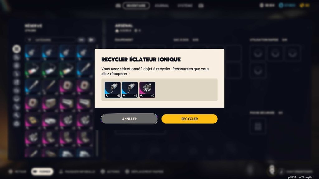 Une fois que vous aurez accompli votre quatrième étape pour votre Projet 2, s’il vous reste encore des Éclateurs ioniques, vous pouvez toujours les recycler : ces derniers vous donneront x8 convertisseurs de tension et x2 modules exode.