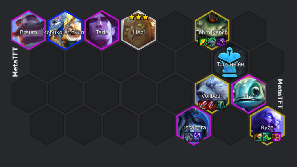 L’objectif est donc d’aller niveau 9 le plus rapidement possible. On envisage cette composition avec un start Bilgewater, beaucoup de paire de Illaoi, une augment d’eco ou d’xp et des items AP. Illaoi 3 étoiles n’est pas obligatoire, mais c’est un vrai plus. On ne va pas roll pour la trouver mais seulement utiliser le shop Bilgewater. Il faudra faire attention à rester à 3 Bilgewater pour s’assurer d’avoir des Illaoi dans le marché noir. N’hésites pas à mettre des Bilgewater sur le bench quand tu relance le shop du marché noir.