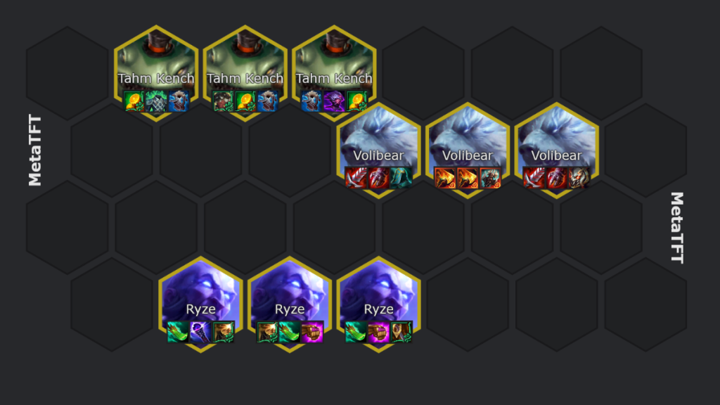 Voici la composition qu’on vise au niveau 9 avec Ryze et Bilgewater. Le plus difficile va être d’arriver au niveau 9 avec suffisamment de gold et de point de vie pour pouvoir trouver les unités importantes de la composition. On va surtout chercher des items AP et Mana pour Ryze et Tank pour Tahm Kench. Les items AD iront sur Volibear et le reste des items AP sur Lissandra.